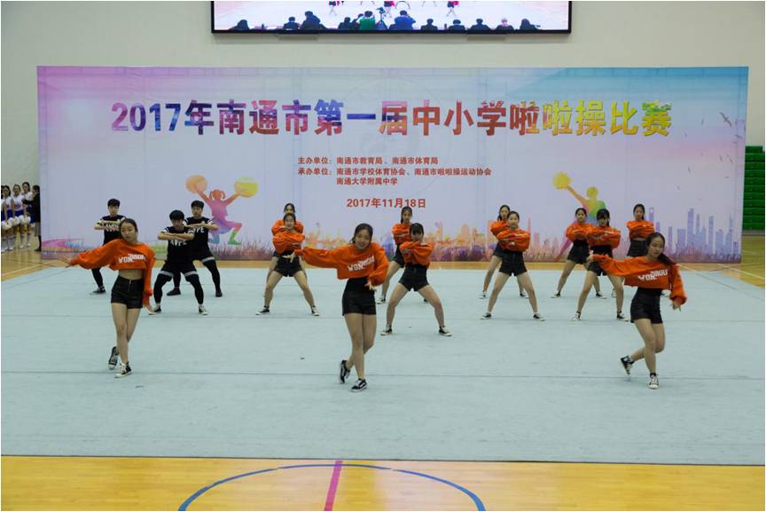 南通市第一届中小学啦啦操比赛于11月18号在我校成功举办,来自全市各中小学共15支代表队389名运动员教练员参加了此次比赛。在欢快热烈的氛围中,本次比赛取得圆满成功!市教育局领导和我校领导亲临现场并给运动队颁奖。